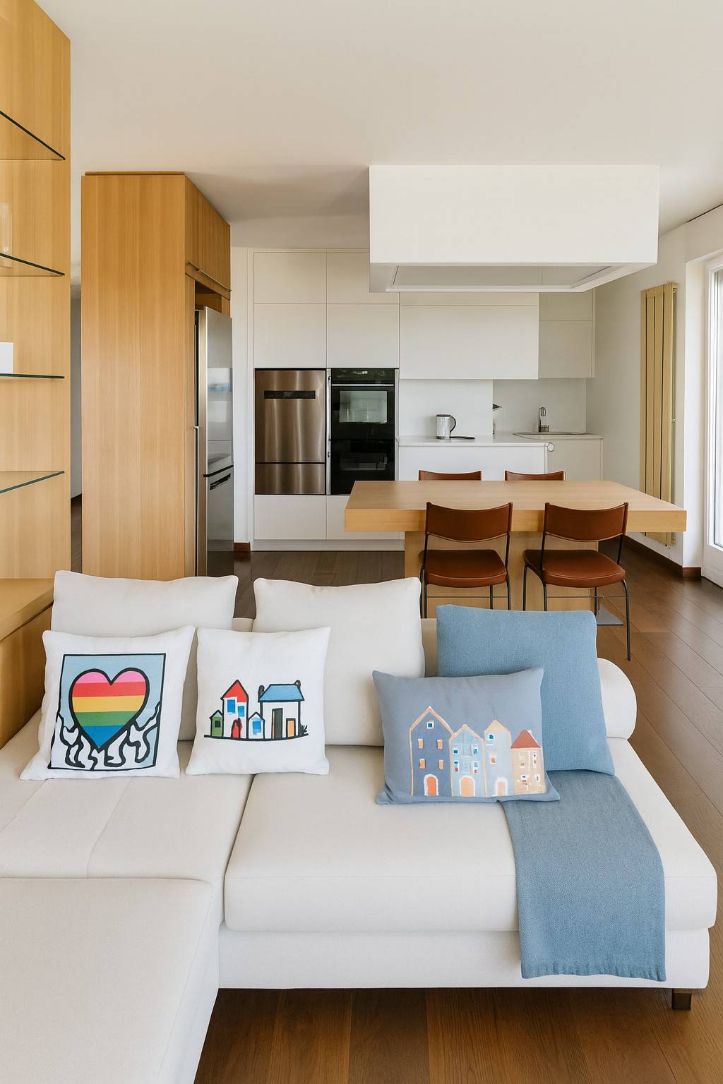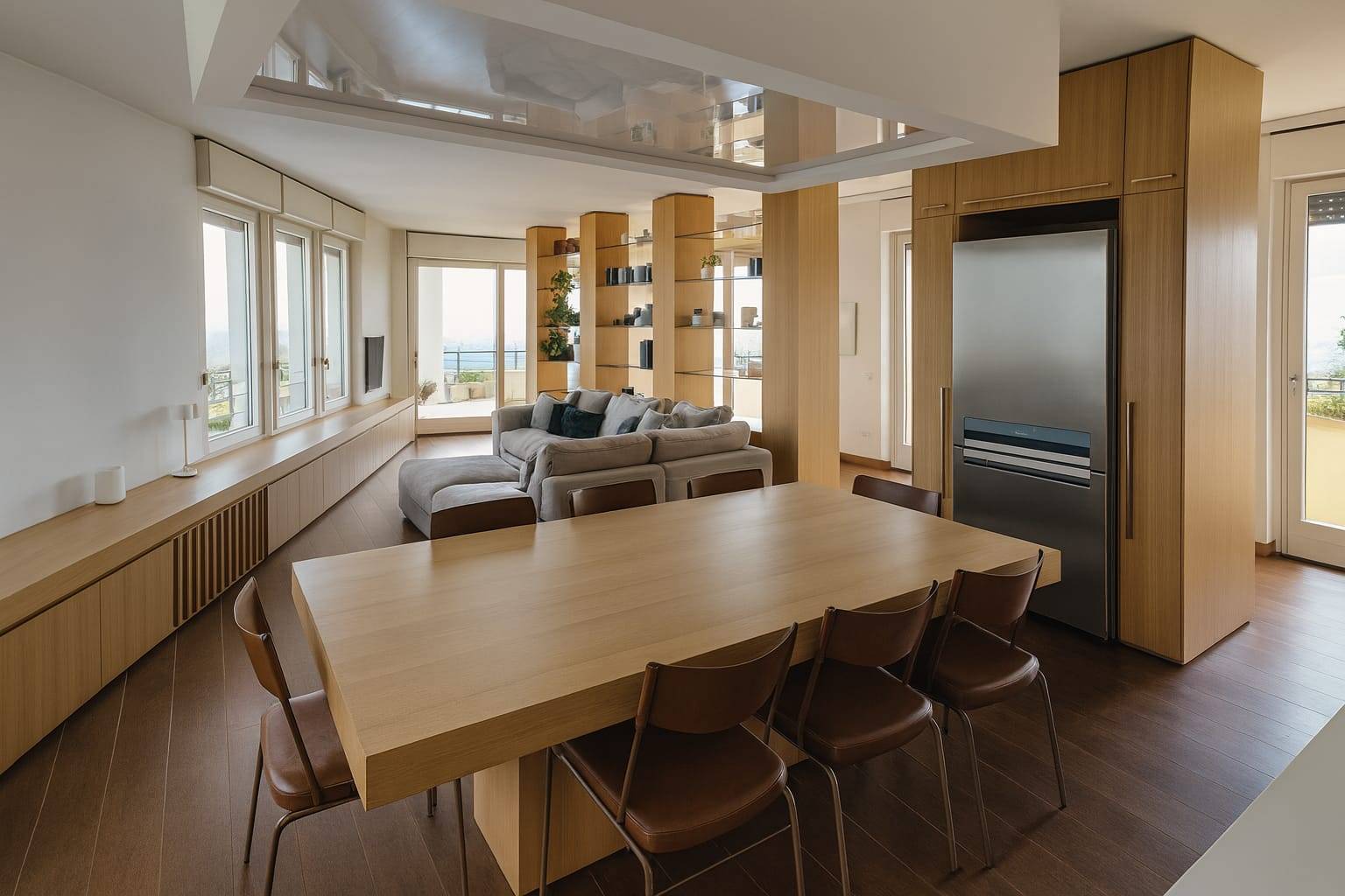 La zona giorno è spaziosa, con cucina a vista e accesso diretto alla terrazza principale.