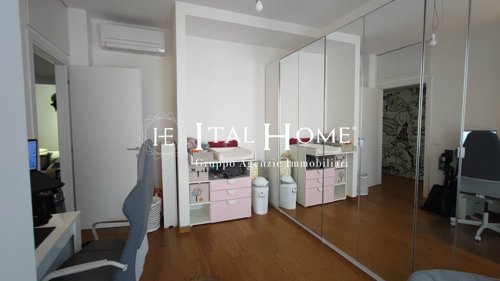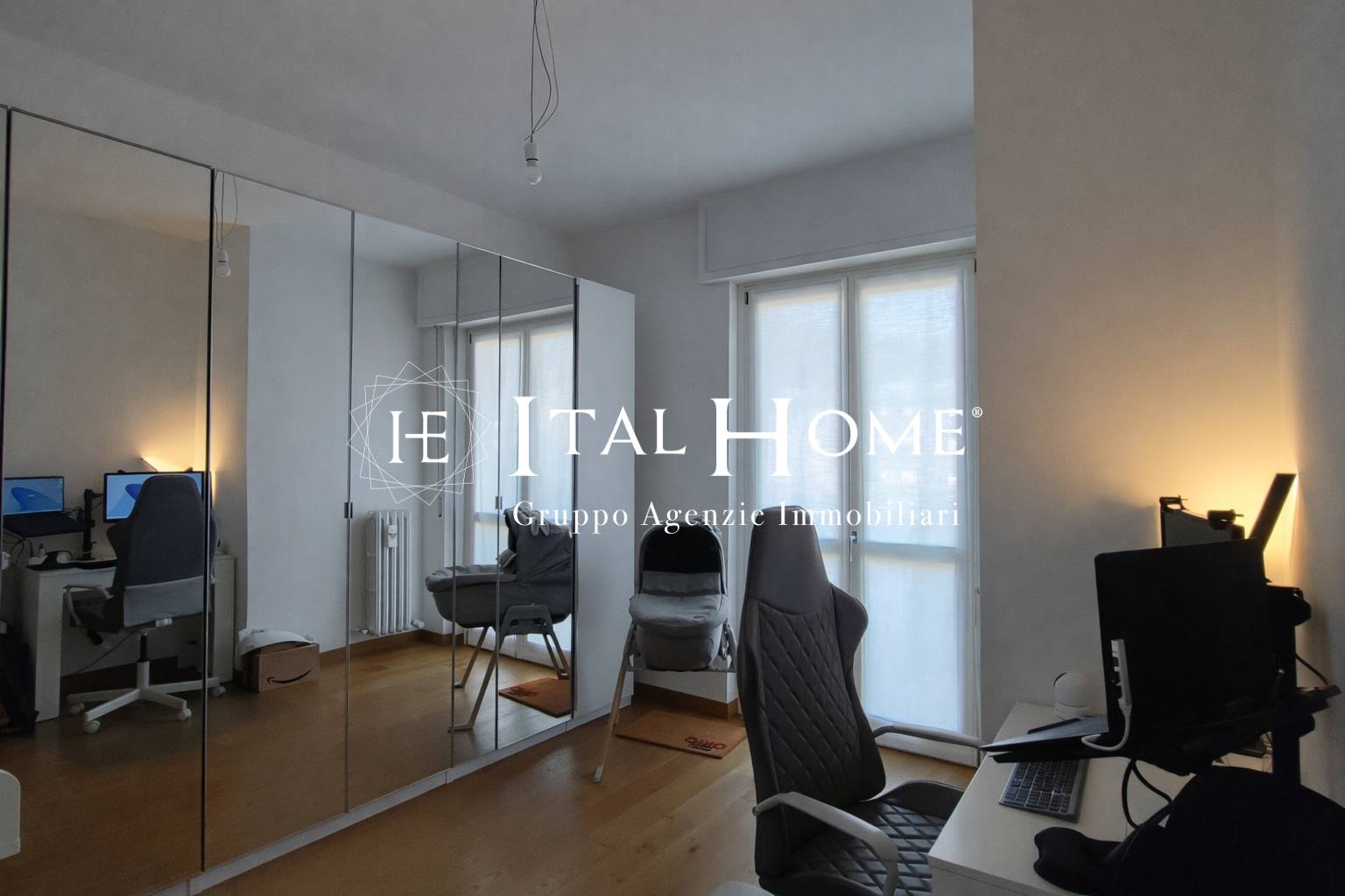 È presente inoltre una seconda stanza versatile, perfetta come studio, cameretta o stanza hobby, valorizzata da armadi a specchio su tutta parete che amplificano la luminosità e aumentano la percezione degli spazi. Anche questa seconda camera è dotata di balcone